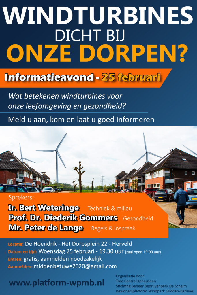 Deze bijeenkomst wordt georganiseerd door Stichting Bewonersplatform Windpark Midden-Betuwe, Stichting Beheer Bedrijvenpark De Schalm en Tree Centre Opheusden. Samen willen zij bewoners, ondernemers en politici de kans geven om zich goed te informeren over de laatste wetenschappelijke inzichten rondom windturbines.
